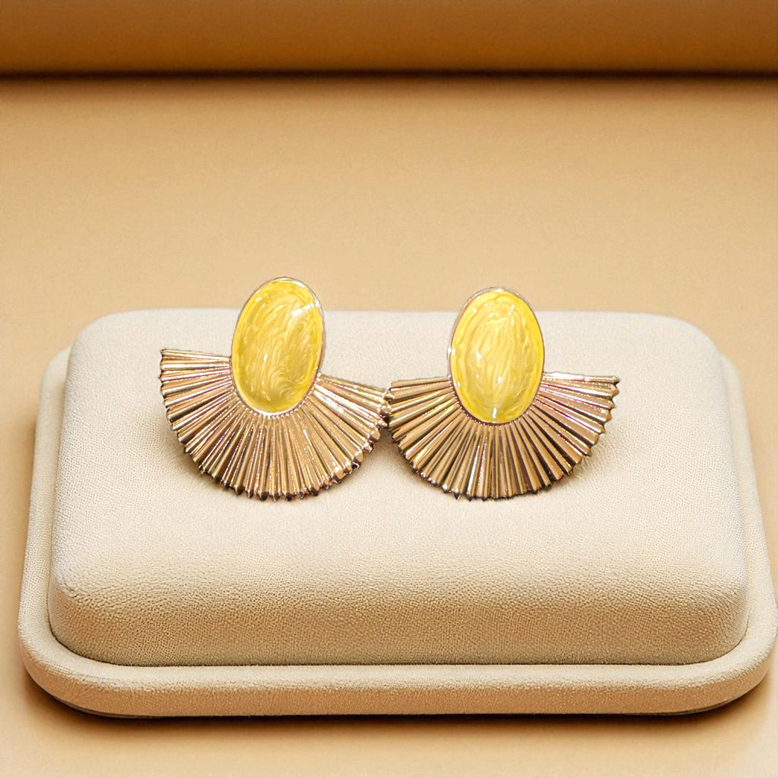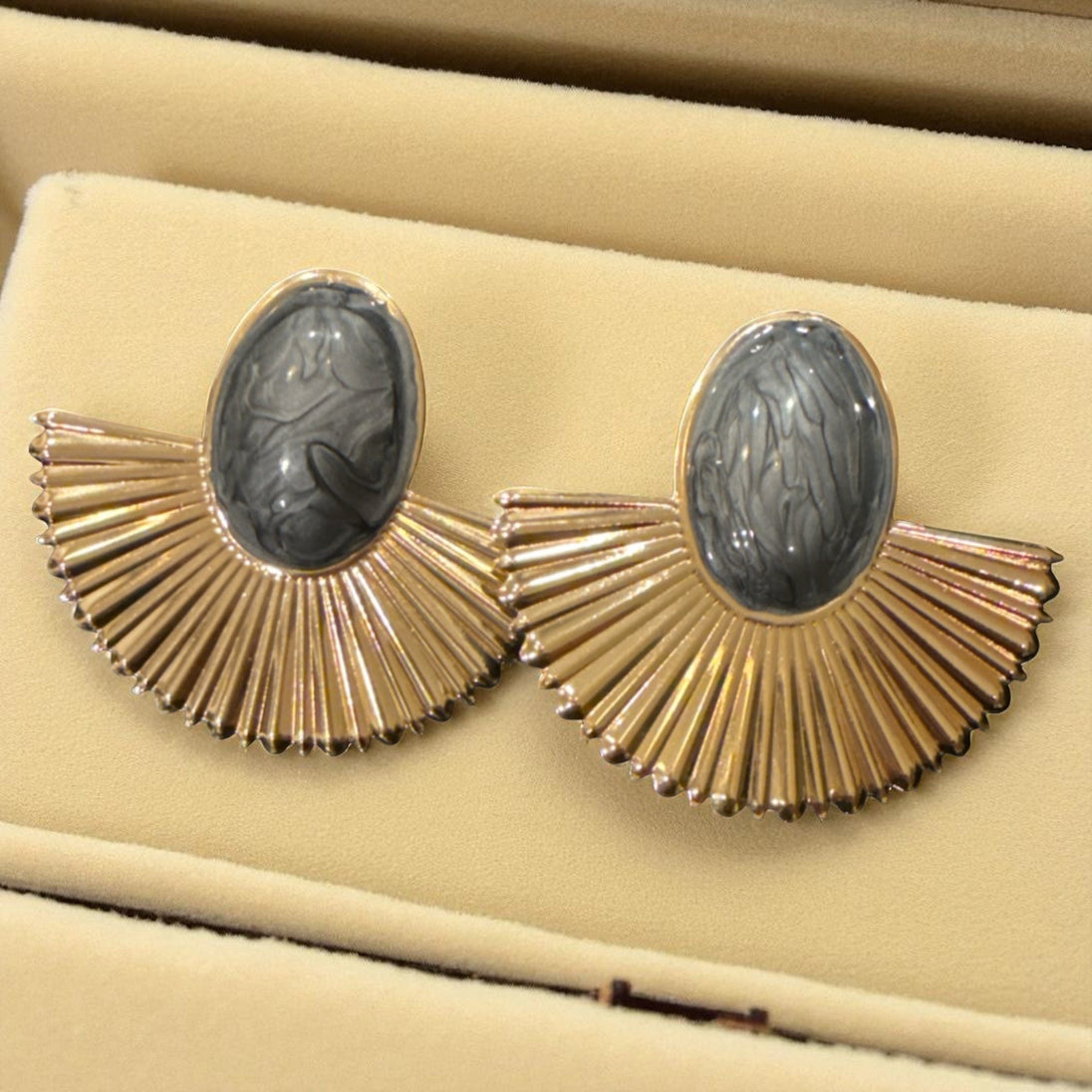 Turn heads with our Radiant Fan Statement Earrings, a striking fusion of bold design and timeless elegance. Featuring a smooth oval stone centerpiece set in a polished frame, these earrings cascade into a radiant fan-shaped gold accent that exudes luxury and sophistication. Perfect for adding drama to an evening look or elevating everyday style, these earrings are the ultimate conversation piece.