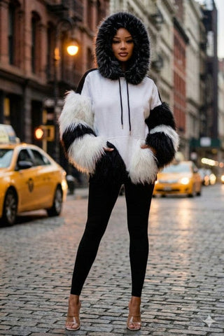Featuring a dramatic faux fur-trimmed hood in black and grey, plus voluminous faux fur sleeves in striking black-and-white colorblock, this piece delivers warmth and street-style impact. Finished with a kangaroo pocket and drawstring neckline for functional style.