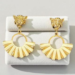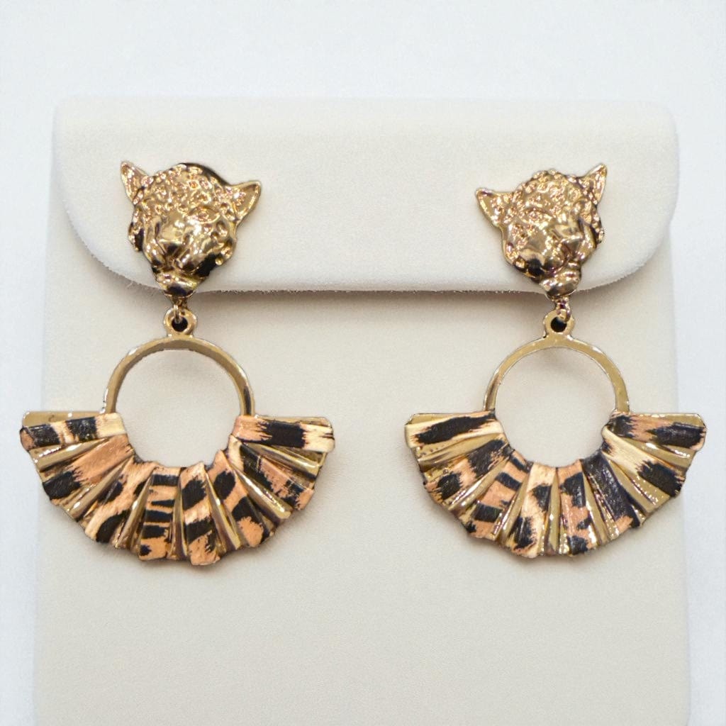 Unleash your bold side with these Panther Drop Earrings, designed to turn heads. Featuring a fierce panther head stud and a striking fan-shaped drop, these earrings blend strength and elegance effortlessly. Available in classic gold and wild animal print, they’re the perfect statement piece to elevate any look.